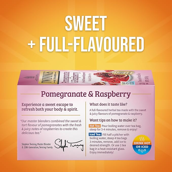 - NATURALLY CAFFEINE FREE: Flavourful herbal tea expertly blended with the fresh, juicy flavours of pomegranate and raspberry to deliver a delicious tea with a bold, fruity aroma and naturally sweet taste; 20 Count, Pack of 6