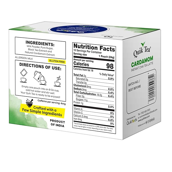QuikTea Cardamom Instant Chai Tea Latte - 10 Count Single Box - Superfood Antioxidant, Digestion Tea