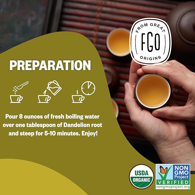 FGO Organic Dandelion Root Loose Tea, Cut and Sifted, Caffeine Free, 16oz Bulk Resealable Bag, Packaging May Vary (Pack of 1)