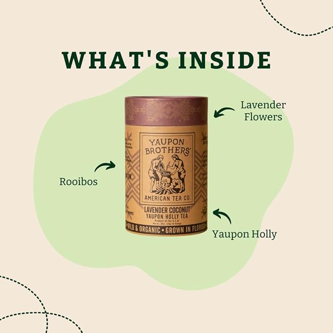 - Lavender Coconut Yaupon Tea – It’s a perfect fusion of organic Yaupon Holly, rooibos, lavender flowers, and bright coconut flavors that unfold into a soothing lavender finish. Enjoy a blend that, hot or iced, is always nice.