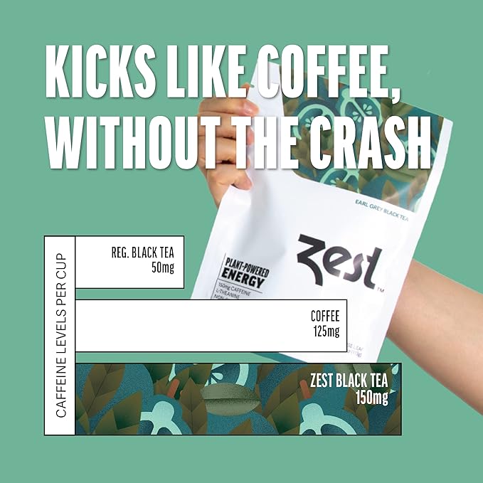 - 150MG CAFFEINE PER CUP: Our strong black hot tea has more caffeine than coffee; 3x the energy levels of traditional caffeinated black teas. This makes Zest the strongest tea on the market, and is the perfect high energy pick me up for your morning or mid-day slump.