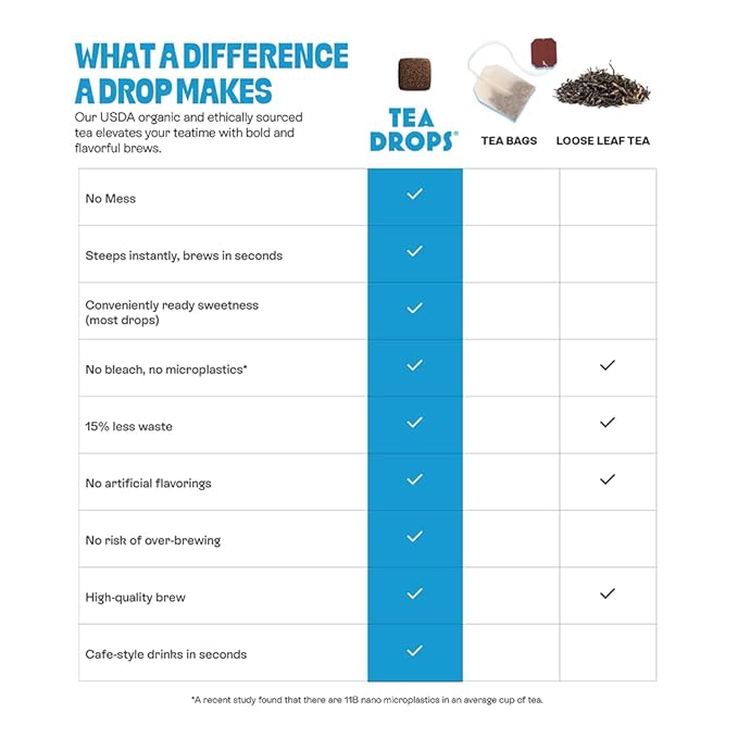 - NOURISHING INGREDIENTS: Treat yourself to the perfect cup of tea that is nutrient-rich, and delicious. All Tea Drops teas are fair trade certified so they can be enjoyed without fear of any artificial additives or preservatives.