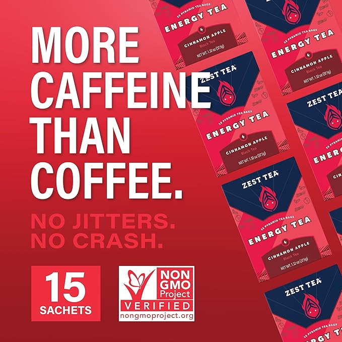 Zest Cinnamon Apple Spice Energy Tea – High Caffeine Black Tea Bags for Focus, Clarity & Morning Energy – Natural Non-GMO Caffeinated Breakfast Tea – Cozy Fall Focus Tea with 150mg Caf – 15Ct Box