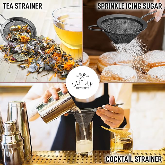 Zulay Kitchen 304 Stainless Steel Fine Mesh Strainer For Kitchen - Sieve Sifters For Food, Tea, Rice, Oil, Noodles, Fruits, Vegetables - Rust-Proof, Easy to Clean Drink Strainer (Black)