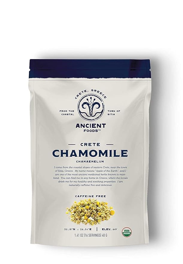 - AUTHENTIC GREEK TEA: Ancient Foods’ Chamomile Tea is a fresh, organic loose leaf tea that is harvested from the coastal slopes of Crete, near Sitia, Greece. It is a naturally caffeine-free tea and is 100% USDA organic certified.