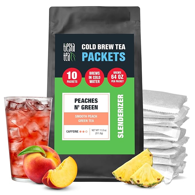 - REFRESHING PEACH GREEN TEA BLEND: Discover the perfect fusion of smooth green tea and ripe peach flavor with Tiesta Tea's Peaches N' Green Cold Brew Tea Packets. This fruity blend offers a satisfying, refreshing drink that’s ideal for cooling down on a hot day or relaxing after a busy one. Simply steep and chill for a delightful tea experience.