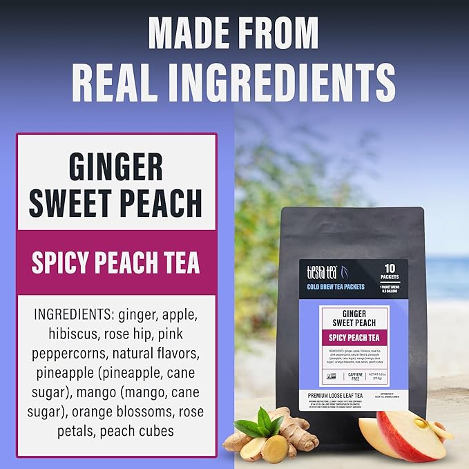- REFRESHING SPICY PEACH HERBAL TEA BLEND: Indulge in the perfect blend of sweet and spicy with Tiesta Tea's Ginger Sweet Peach Cold Brew Tea Packets. This loose-leaf herbal tea combines the juicy, vibrant flavor of peach chunks with the warm, zesty kick of ginger. Designed for cold brewing, this blend offers a refreshing, satisfying drink, ideal for any time of day. Enjoy a flavorful, energizing tea experience with every chilled sip.