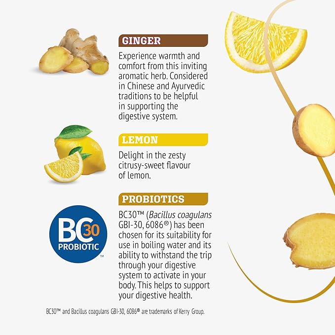 - 250-MILLION CFUs PER CUP: Soothing citrus tones combined with a subtle ginger kick and the warming taste of turmeric; Caffeine free herbal tea; Added probiotics bring goodness to your cup without added taste