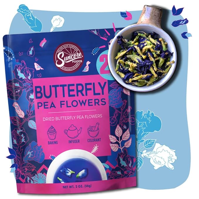 - Tips And Tricks - These beautiful flowers aren't just meant to make teas; they're a spectacular way to add color and aroma. Try infusing them into your water when you're making your next batch of rice or noodles and create gorgeous blue meals that can magically turn into purple with the addition of citrus! Bonus: Suncore Foods blooms are great to mix together to create your very own super blend