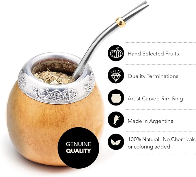 - NATURALLY AUTHENTIC - Authentic handcrafted in Argentina mate y bombilla. No machines, a unique style and artwork making each piece unique. Each Calabash Gourd grows uniquely, at his time and form. No two are the same. Some are bigger, some are smaller. Nature does not repeat - it creates. Years pass by and every sip brings sweet memories and special feelings with a unique taste that only a natural Gourd can provide. Contains approximately 7 oz I 200 ml. The Bombilla Is 5.5 inch I 14 cm long.