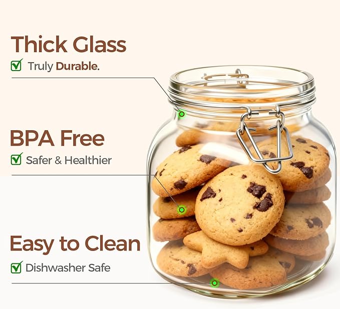 - Airtight Food Storage Jar: Glass jars with airtight lid is made of food-graded glass; Each glass container is well sealed, equipped with a silicone gasket and stainless iron locking clamp to make sure your food stay clean, fresh and safe while in storage