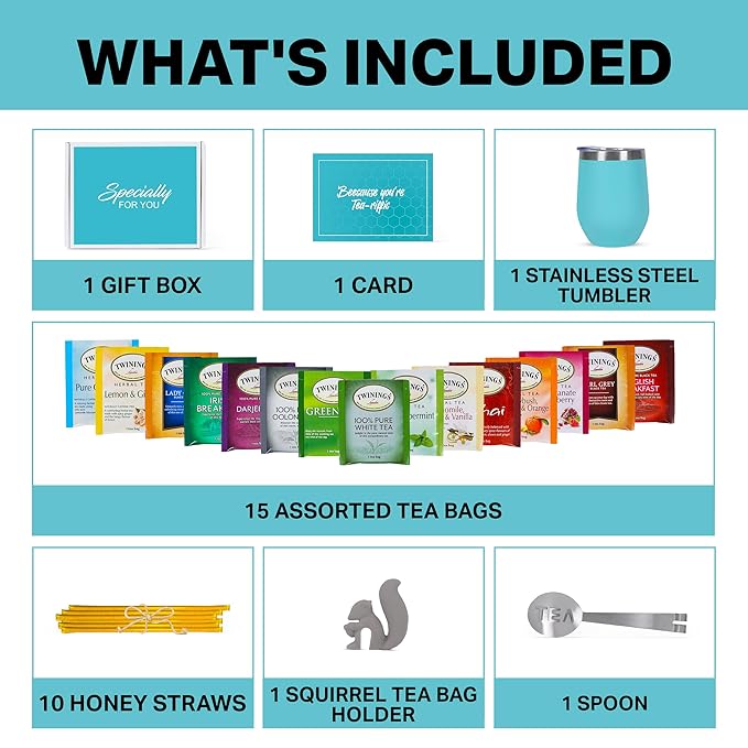 - COMPLETE TEA GIFT SET WITH ACCESSORIES: This set includes 15 delicious tea blends like peppermint, ginger, and lemon, as well as a tea bag holder shaped like a squirrel, a tea spoon, and a 12oz insulated tumbler. The tumbler keeps drinks hot for 3 hours and cold for 9 hours. With everything you need to brew and enjoy your tea, it’s an ideal gift for any tea lover, whether for quiet moments or on-the-go enjoyment.