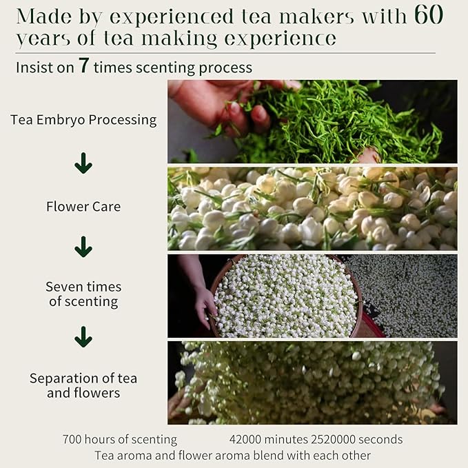 - This tea is not simply a combination of flowers and tea, but is made by an experienced tea maker with 60 years of tea making experience. It is brewed through seven rounds of fermentation (allowing the tea leaves to fully absorb the floral aroma) and one round of fragrance extraction (using a small amount of jasmine flowers for another fermentation). Each jasmine dragon bead takes 700 hours to slowly absorb the fragrance, combining both jasmine and tea aromas, and can be brewed multiple times