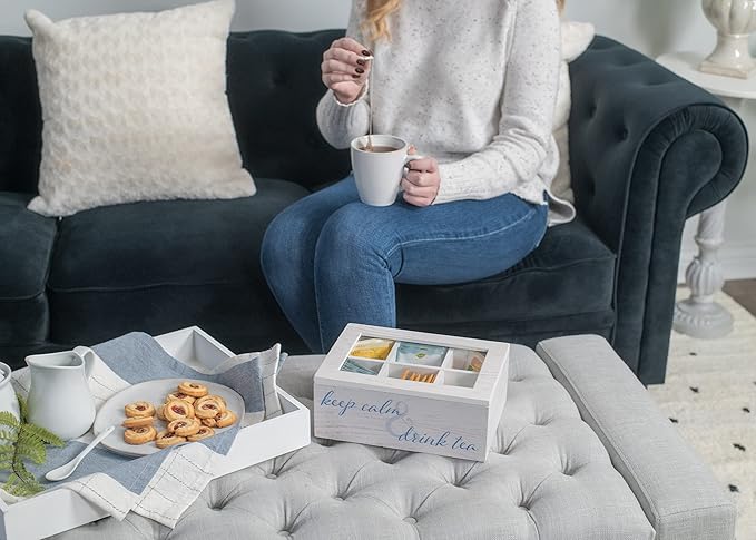 - CRAFTED FROM PINE WOOD WITH DISTRESSED WHITEWASH FINISH - Includes a glass lid and six sections for storing tea bags