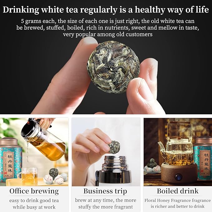 - XIXICHA After many years of dry warehouse transformation of alpine white peony tea, each one is round and full, and the white tips are obvious. The alpine raw materials are hand-kneaded into a ball shape, which has a good appearance and a strong peony aroma. Place 1 white peony Dragon Ball in a cup. Add boiling water to the cup and let it steep for 5–8 minutes before drinking.