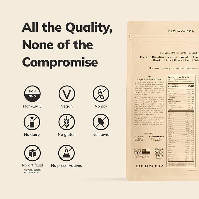 - FULL OF NUTRIENTS, NOT FILLERS: It's about what's inside – and what's not. Ka'Chava is non-GMO with no whey, no gluten, no soy, no dairy, and no artificial colors, flavors, or sweeteners. Just quality ingredients your body will love.