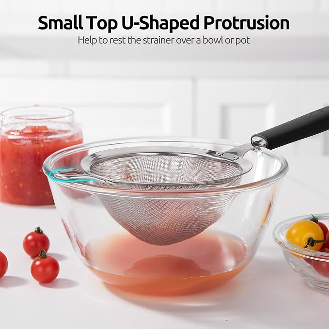 - [Food Grade 18/8 Stainless Steel] No rusting issues with U-Taste fine mesh strainer. It is safe to sieve ingredients during food prep and strain food (like juice, jam, and broth) to serve. The 30 mesh screen is firm, showing no sign of deforming when you pat on it, capable to bear heavy foods up to 5 KG. U-Taste applied special technique into the production process to make sure its mesh tightly connected with the rim, so they will not easily rip or tear when pressing ingredients through.