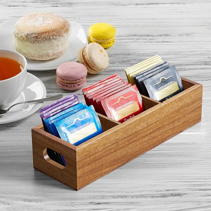 - CUSTOMIZED COMPARTMENTS: DRASTAR tea bag holder includes 2 removable dividers that you can adjust as needed. Wood tea holder can also be used as a good wooden organizer box for tea, sugar, or water packets