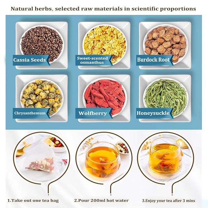 - 【Expert Formulation】Our tea blends chrysanthemum, cassia seed, burdock root, goji berries, osmanthus, and honeysuckle, following traditional Chinese practices and modern scientific principles for optimal flavor and health benefits.