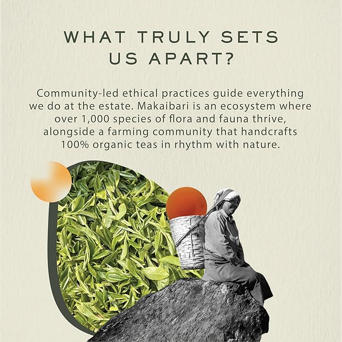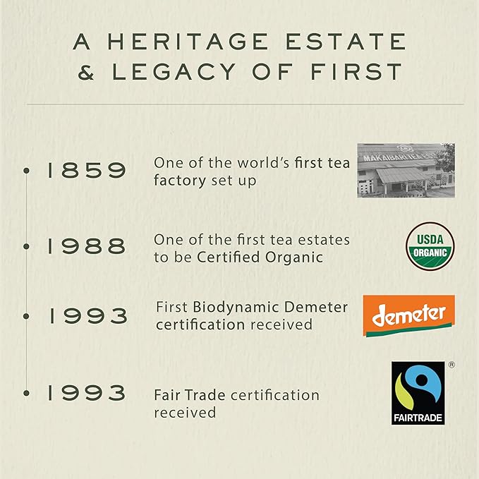 - DEMETER AND FAIR TRADE CERTIFIED - One of the first tea estates in the world to get demeter certification that is given for biodynamic practices observed at the estate, Makaibari is Certified Biodynamic since 1988. This implies that the estate uses practices that are healthy for the soil and the garden, no harmful pesticides or chemicals that leech into the pristine soil or harm the flora, fauna at the estate, are ever used.