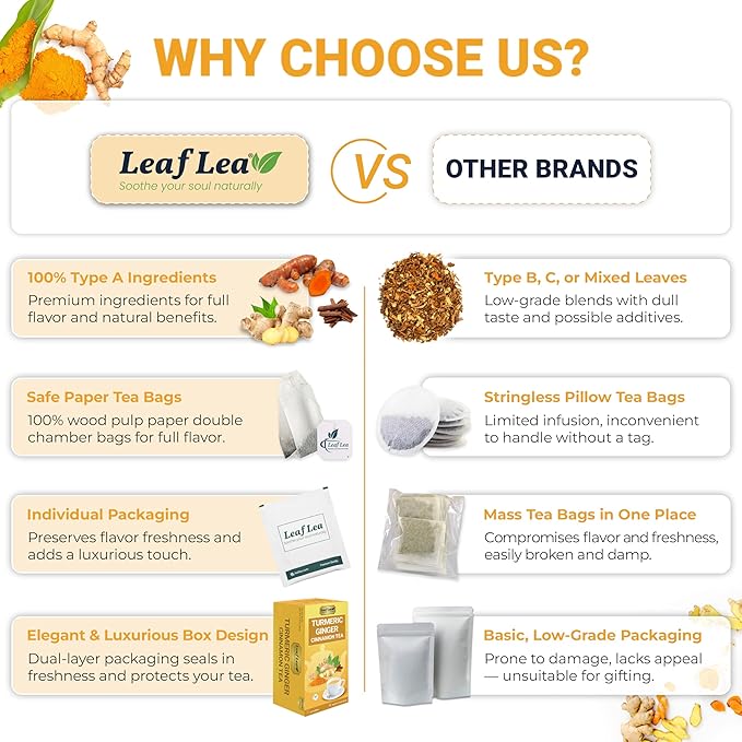 - Sustainable & Luxurious Design – Our turmeric ginger tea bags are made from paper materials that enhance tea flavor diffusion. Each turmeric and ginger tea bag is individually wrapped in a foil-lined paper bag to lock in freshness and aroma. Packaged in a beautifully designed, sturdy paper box, this premium product makes a perfect gift for health-conscious individuals who appreciate quality and style.