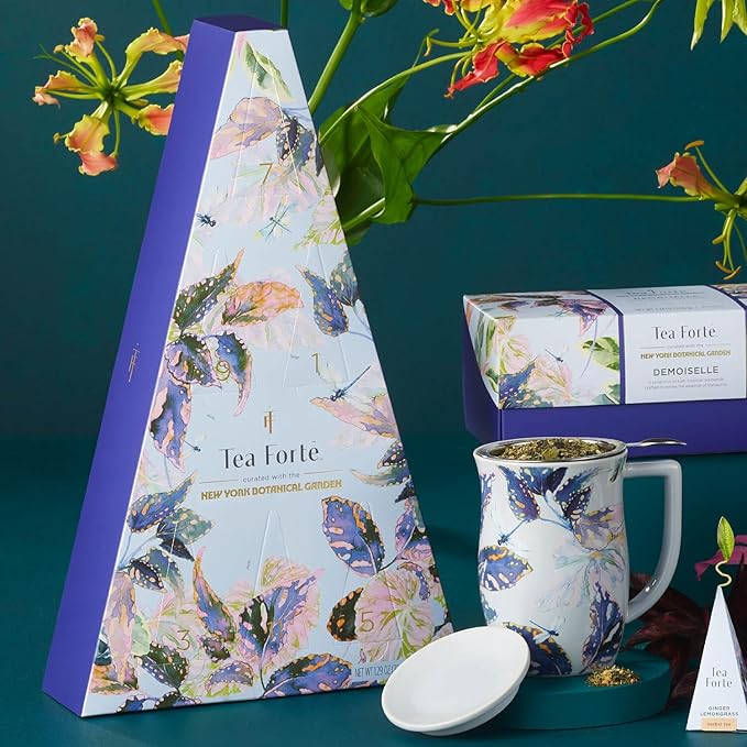 Tea Forte Tea Advent Calendar Gift Set; 12 Individually Wrapped Handcrafted Assorted Pyramid Infuser Tea Bags with Numbered Doors, Demoiselle