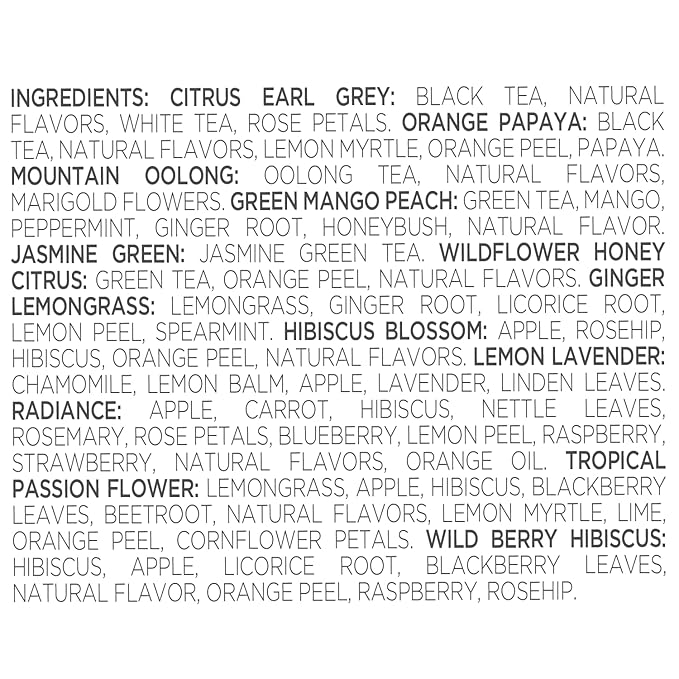 - TEA BLENDS INCLUDED: Citrus Earl Grey, Orange Papaya, Mountain Oolong, Green Mango Peach, Jasmine Green, Wildflower Honey Citrus, Ginger Lemongrass, Hibiscus Blossom, Lemon Lavender, Radiance, Tropical Passion Flower, Wild Berry Hibiscus