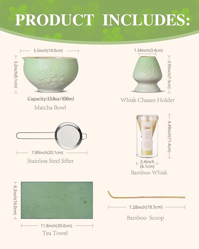 - Complete Matcha Kit – This set includes 6 essential matcha accessories: 1 Bamboo Matcha Whisk (Chasen), 1 450ml/15oz Matcha Bowl, 1 Whisk Holder, 1 Bamboo Scoop, 1 Absorbent Tea Towel, and 1 Stainless steel sifter – Each tool is crafted with precision, everything you needs for an effortless and an authentic matcha-making experience. (Matcha powder not included.)