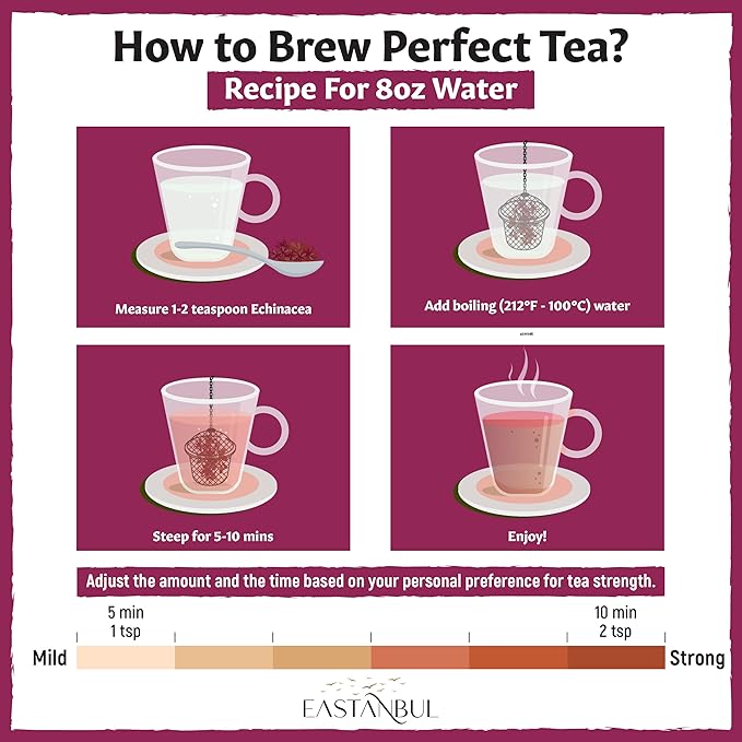 - Dried Echinacea for Tea & Infusions : Whether you prefer a hot herbal infusion or a cold brew, our echinacea tea loose leaf herb is versatile and easy to use. Simply steep 1-2 teaspoons of dried Echinacea Purpurea flowers and leaves in hot water for 5-10 minutes to make a delicious, all-natural Echinacea tea. Add honey, lemon, or your favorite sweetener for extra flavor, if desired
