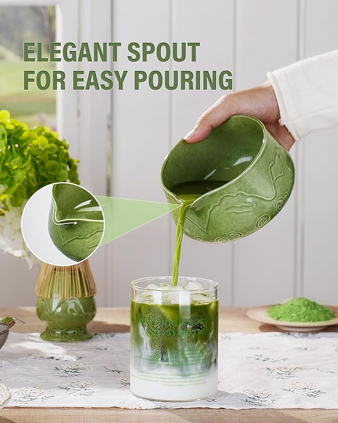 - High-Quality Ceramic Matcha Bowl - Made from durable, high-temperature fired porcelain, the matcha bowl and whisk holder are lead-free. Both The exterior and inner emerald green glaze is 100% hand-sprayed by artisans, natural and sleek that adds an aesthetic but also facilitates easy cleaning by preventing tea stains and residues from sticking.