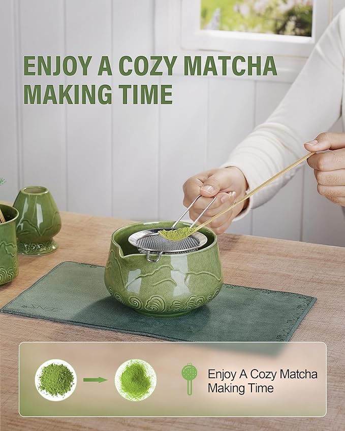 - 6pcs Complete Matcha Kit – This set includes 6 essential matcha accessories: 1 Bamboo Matcha Whisk (Chasen), 1 450ml/15oz Matcha Bowl, 1 Whisk Holder, 1 Bamboo Scoop, 1 Absorbent Tea Towel, and 1 Stainless steel sifter-Each tool is crafted with precision, everything you needs for an effortless and an authentic matcha-making experience. (Matcha powder not included.)