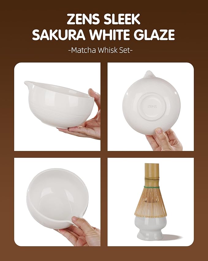 - Sleek Pure White Glaze – Inspired by traditional Japanese matcha culture, the ZENS matcha whisk set features a sleek pure white glaze, seamlessly blends the art of matcha with aesthetic appeal. The natural white ceramic matcha bowl and absorbent tea towel complete the perfect matcha ceremony experience.