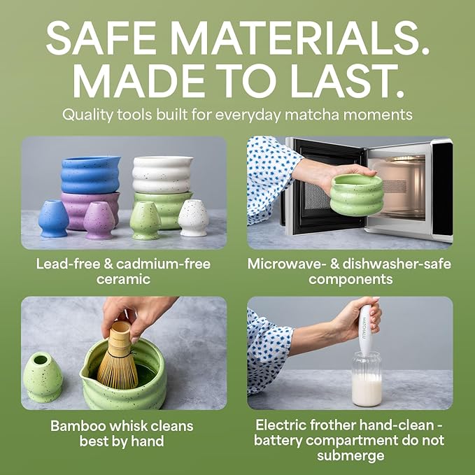 - Premium Quality: Crafted from food-grade, lead-free, and cadmium-free materials, this matcha bowl is built for durability and long-lasting use. Its wide-mouth design allows for effortless whisking, and it is both microwave and dishwasher safe for added convenience. The matcha whisk is made from 100% natural bamboo, free from varnishes, chemicals, or artificial coatings, ensuring a pure and authentic matcha experience.