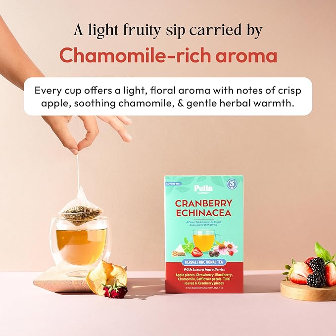 Cranberry Echinacea Chamomile Tea with Blackberries, Strawberry, Tulsi Basil & Safflower – Vegan Kosher Naturally Caffeine Free – Traditional Herbal Blend for Wellness & Antioxidant Rich (25 Tea Bags)