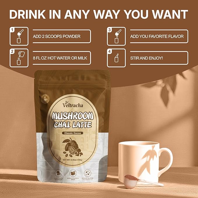Veltracha Mushroom Chai Tea, Instant Decaf Chai Tea Powder with 6 Adaptogenic Mushrooms, Spiced Chai Latte for Energy & Focus Support, 6.35 oz 20 Servings (Classic Cocoa)