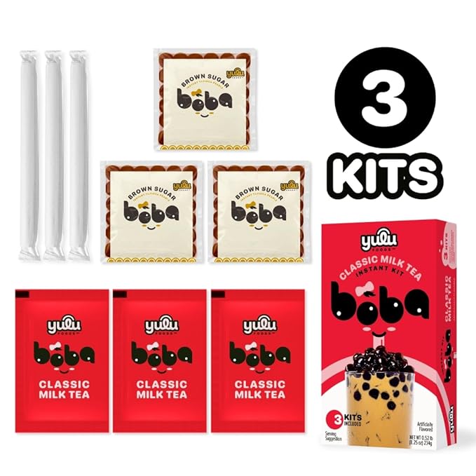 YULU FOODS Instant Bubble Pearl Classic Milk Tea Kit with Authentic Brown Sugar Tapioca Pearls, Ready in Under One Minute, Paper Straws Included – 3 Servings