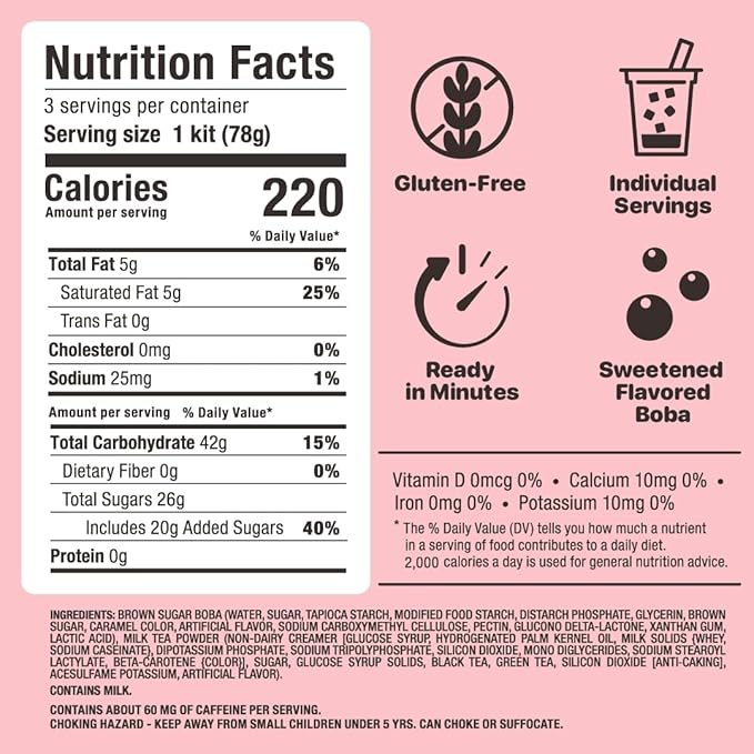 - CONVENIENT AND EASY - Forget large batches, using bubble tea machines or washing pots & pans to make bubble tea. Take a Pearl set to the office or school for an easy snack, or stock up your pantry for at home use! WHAT IS INSIDE- 3 Individually wrapped portions of brown sugar flavored pearl, 3 Classic milk tea packets, & 3 extra wide paper straws. Store in a cool, dry place (no refrigeration necessary).