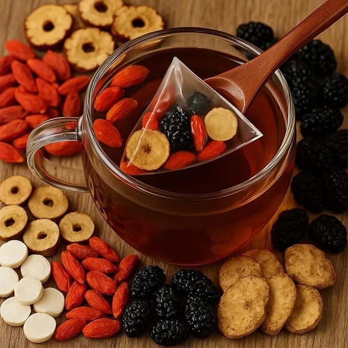 - Ginseng & Mulberry Herbal Tea: Experience a rich flavor, with the earthy flavor of ginseng complemented by the natural sweetness of red dates and mulberries.