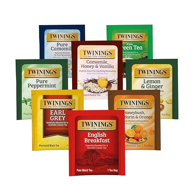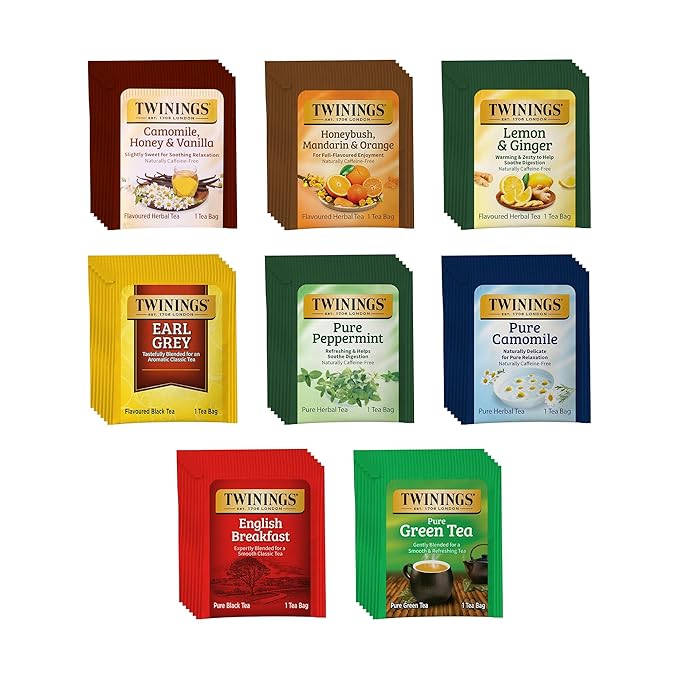 - Twinings 48pcs Herbal Tea Bag Variety Pack: Enjoy 48 herbal tea bags in 8 unique flavors. Herbal teas are naturally caffeine-free, making them a soothing choice for any time of day.