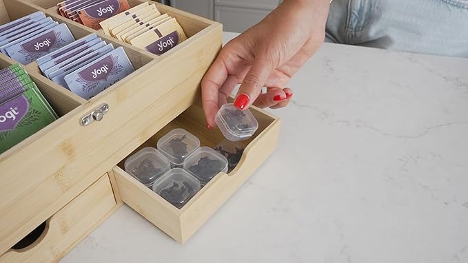 - KEEP YOUR TEA ORGANIZED & FRESH: This natural bamboo tea bag organizer offers 12 spacious compartments for sorting different tea flavors including 4 extra deep compartments to maximize storage. Ensuring easy access and an organized kitchen space. Perfect for tea bags, herbs, and spices, this box keeps everything fresh with its PREMIUM SAFETY HASP LATCH.
