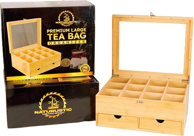 Naturustic Large Bamboo Tea Bag Box Organizer Storage Box, Tea Bag Holder with 2 Drawers & 12 compartments with acrylic Window, Caja de te, Caddy para te Ideal Christmas Gifts