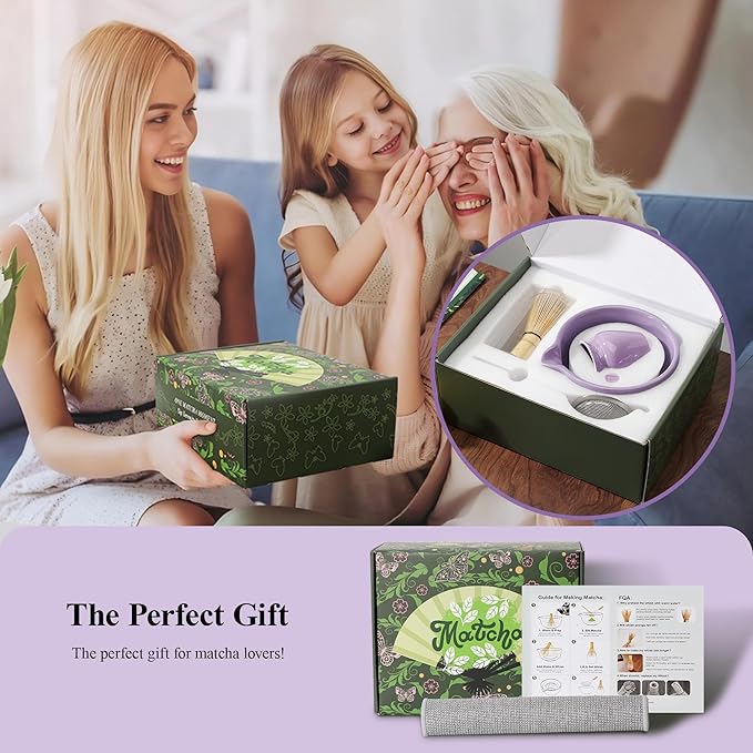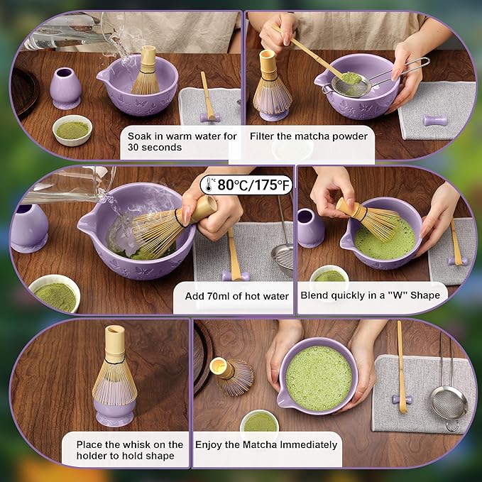 - 7Pcs Packaging: This matcha set includes the necessary tools for creating an authentic matcha experience: ceramic matcha bowl, ceramic whisk holder, bamboo matcha whisk, bamboo spoon, spoon stand, powder starter sifter, tea towel and manual. 7PCS matcha whisk set can fully meet the steps required to make matcha and enjoy a more pleasant matcha time