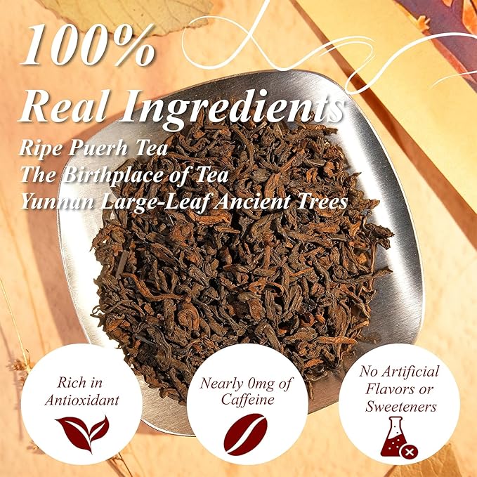 - 【Comforting & Decaffeinated】Naturally decaf, this ripe Pu-erh is ideal for after meals, evening relaxation, or meditative tea sessions—no jitters, just calm