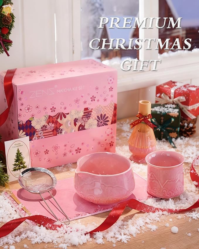 ZENS Matcha Whisk Set, 6pcs Matcha Set Pink Includes 15oz Ceramic Bowl and Bamboo Whisk (Chasen Holder) Scoop, 304 Sifter & Pink Tea Mat, Japanesse Matcha Kit for Matcha Latte-Making