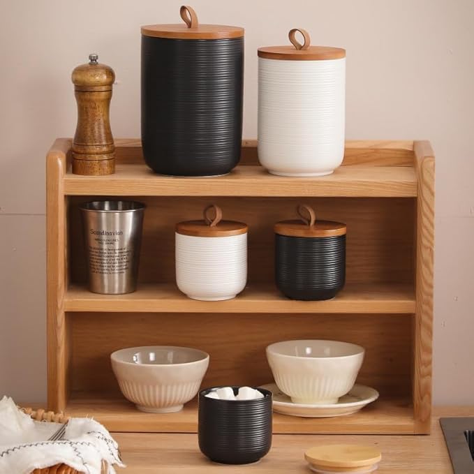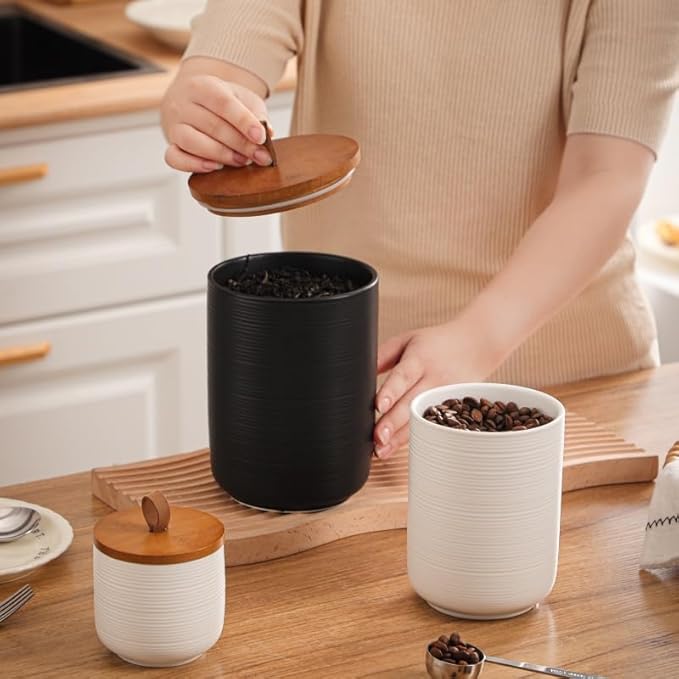- 【Airtight Food Storage】 Food canister is made of ceramic with nice matt glaze, simple white or black design, lead-free and lightproof. The silicone seal ring of the bamboo lid makes the kitchen canisters set of 3 air-tight, the original bamboo wooden lid has a slight odor what doesn't affect the use
