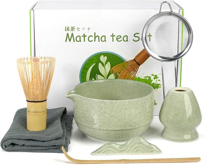 - 🍵【7PCS PERFECT MATCHA STARTER KIT】Dive into the world of matcha right away! This all-inclusive 7-piece matcha set kit have every tool you need:a whisk,ceramic bowl,scoop,sifter,whisk holder,spoon holder and a tea towel.Everything required for a seamless matcha ritual at home.The matcha whisk and bowl set is ideal for making traditional and delicious matcha at home and in the kitchen.
