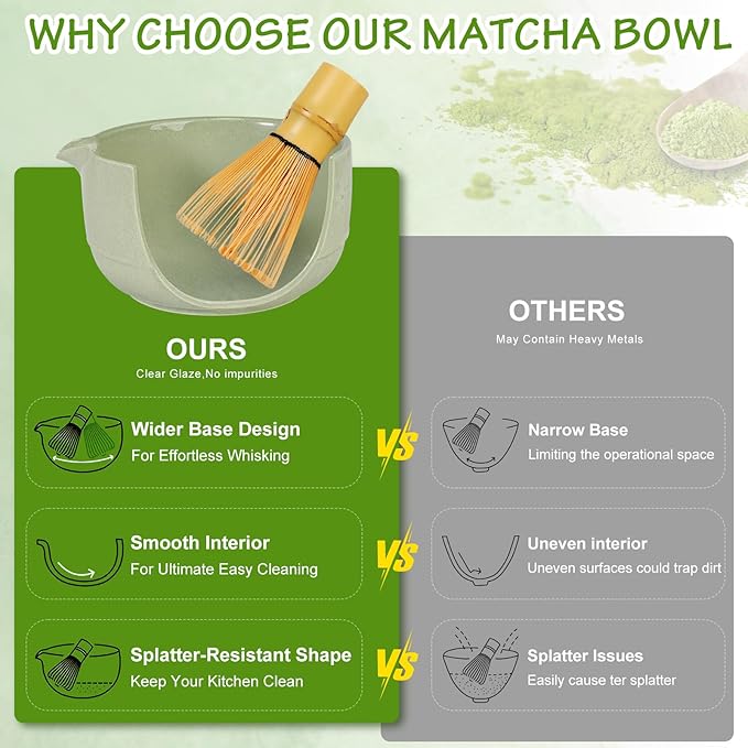 - 🍵【SUPERIOR MATCHA WHISKING PERFORMANCE】Every piece is made from sustainable materials-Matcha whisk boasts 100 finely crafted prongs which making even stirring,mixing and frothing.Our ultra-fine stainless steel sifter and unique scoop work together to effortlessly break down the toughest clumps, guaranteeing a silky-smooth, lump-free cup of matcha in seconds.Matcha bowl is made of high advanced food-grade ceramic materia,high and low temperature resistant,safe,sturdy and durable.