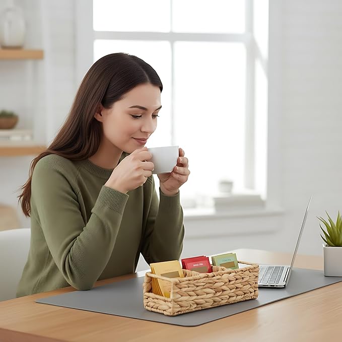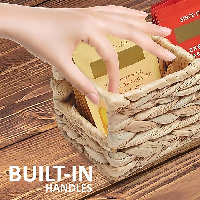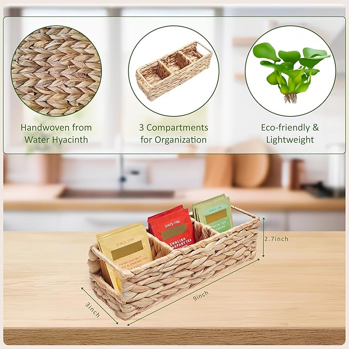- THE TRILUXE 3-COMPARTMENT CADDY: Elevate your daily routine with the Triluxe tea bag holder. Meticulously handwoven from natural water hyacinth, this compact organizer brings a warm, boho-chic charm to any kitchen counter, coffee bar, or tea station.
