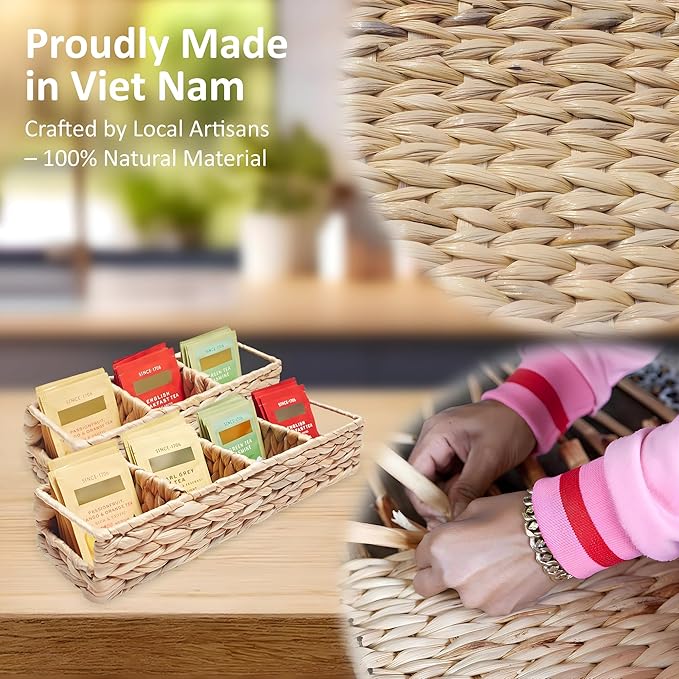 - ARTISAN CRAFTED QUALITY: Each tea box organizer is hand-woven by skilled Vietnamese artisans over a sturdy iron frame. This ensures your tea storage is not only beautiful but also durable and stable for daily use, adding a touch of natural elegance to your home.