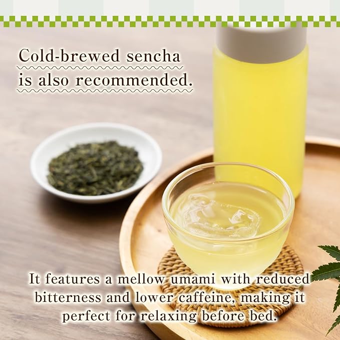 - Refreshing Cold Brew, A Moment of Relaxation: For Cold Brew Sencha: Just place 0.18-0.28 oz (5-8g, tea bags recommended) of tea leaves and 17 fl oz (about 2 cups) of water into a bottle, then extract in the refrigerator for approximately 4 hours. Low-temperature extraction maximizes the umami-rich amino acids, resulting in a mellow mouthfeel with suppressed astringency. Since less caffeine is extracted, it is also recommended for a relaxing time before bed.